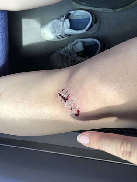 然後才有時間脫下長褲,檢視自己的傷口,爆炸痛。