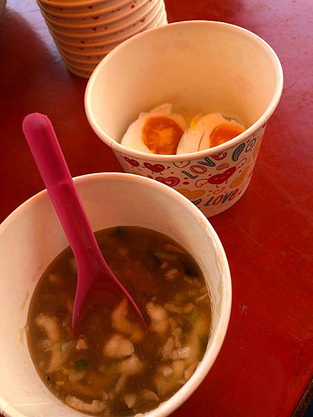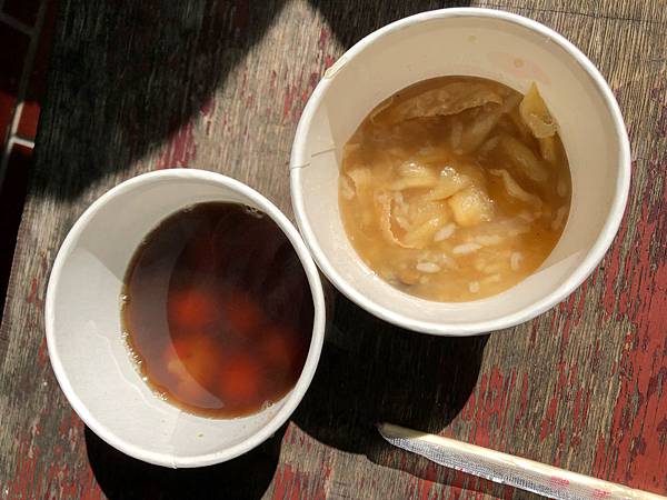 品嚐菜色:鹹粥、甜湯圓。(都由專人幫你裝好)